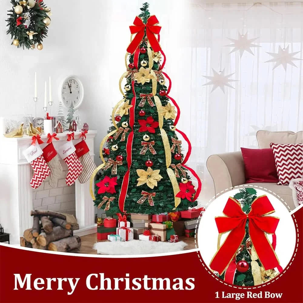 This tree is not just about convenience—it’s about luxury. The pre-lit design is enhanced with 18 beautifully crafted Christmas balls, 18 elegant flowers, 12 festive bows, and 6 decorative ribbons. Every ornament, from the gold and red balls to the intricate bows, is thoughtfully arranged to provide a festive look that radiates holiday cheer.